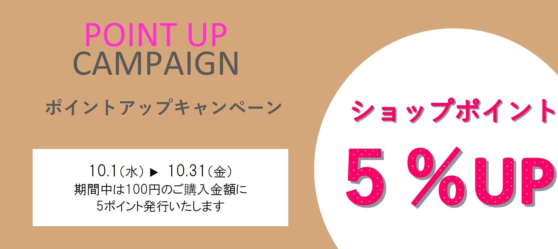 通常100円につき「1ポイント」のところ「5ポイント」へポイントアップいたします。