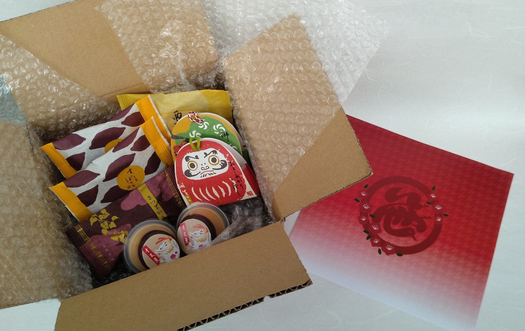 縁起のよい「おきあがりこぼし」や愛らしい干支のイラストが入った「干支菓」をセットにしております。
